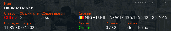Последний раз был в сети 11:35 30.07.2025 Игрок с таким ником замечен на 4 серверах