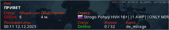 Играет на Counter Strike Global Offensive сервере. Страна: РоссияПервый раз замечен 22:49 11.12.2025