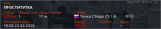 Играет на Counter Strike 1.6 сервере. Страна: РоссияПервый раз замечен 20:14 18.02.2026