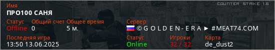 Играет на Counter Strike 1.6 сервере. Страна: РоссияПервый раз замечен 13:48 13.06.2025