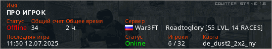 Играет на Counter Strike 1.6 сервере. Страна: РоссияПервый раз замечен 16:09 22.04.2025