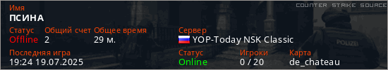 Играет на Counter Strike Source сервере. Страна: РоссияПервый раз замечен 18:17 10.07.2025