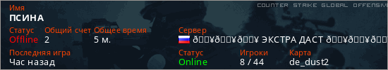 Играет на Counter Strike Global Offensive сервере. Страна: РоссияПервый раз замечен 23:55 05.04.2026
