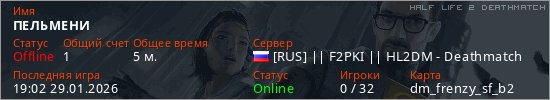 Играет на Half Life 2 DeathMatch сервере. Страна: РоссияПервый раз замечен 17:26 29.01.2026