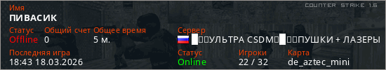 Играет на Counter Strike 1.6 сервере. Страна: РоссияПервый раз замечен 18:41 18.03.2026