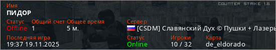 Играет на Counter Strike 1.6 сервере. Страна: РоссияПервый раз замечен 19:23 19.11.2025