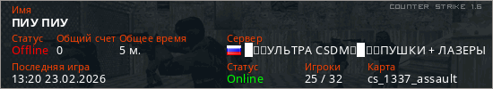 Играет на Counter Strike 1.6 сервере. Страна: РоссияПервый раз замечен 12:50 23.02.2026