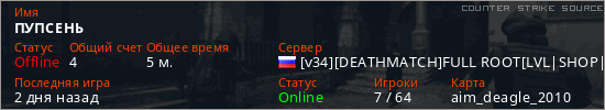 Играет на Counter Strike Source сервере. Страна: РоссияПервый раз замечен 18:09 17.12.2025