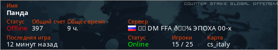 Играет на Counter Strike Global Offensive сервере. Страна: РоссияПервый раз замечен 00:04 25.02.2026