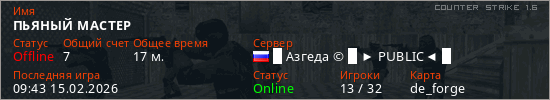 Играет на Counter Strike 1.6 сервере. Страна: РоссияПервый раз замечен 08:09 15.02.2026