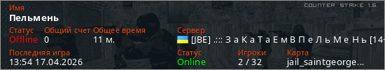 Играет на Counter Strike 1.6 сервере. Страна: УкраинаПервый раз замечен 00:29 11.04.2026