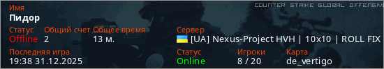 Играет на Counter Strike Global Offensive сервере. Страна: УкраинаПервый раз замечен 22:47 30.12.2025