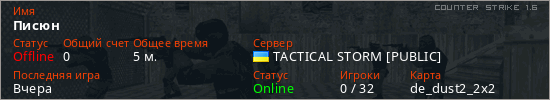 Играет на Counter Strike 1.6 сервере. Страна: УкраинаПервый раз замечен 17:06 08.03.2026