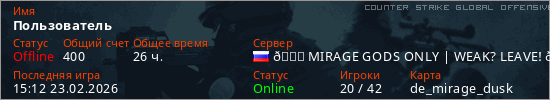 Играет на Counter Strike Global Offensive сервере. Страна: РоссияПервый раз замечен 12:39 29.02.2024