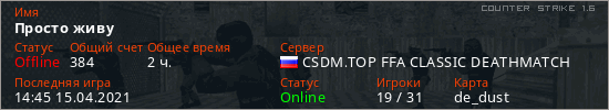 Играет на Counter Strike 1.6 сервере. Страна: РоссияПервый раз замечен 10:54 12.08.2020