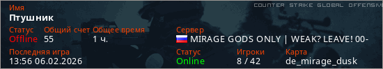 Играет на Counter Strike Global Offensive сервере. Страна: РоссияПервый раз замечен 17:59 30.11.2025