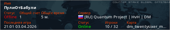 Играет на Counter Strike Global Offensive сервере. Страна: РоссияПервый раз замечен 20:39 03.04.2026