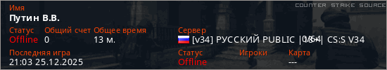 Играет на Counter Strike Source сервере. Страна: РоссияПервый раз замечен 18:02 24.12.2025