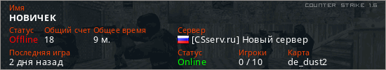 Играет на Counter Strike 1.6 сервере. Страна: РоссияПервый раз замечен 15:17 01.03.2026