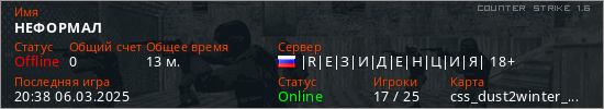Играет на Counter Strike 1.6 сервере. Страна: РоссияПервый раз замечен 19:13 02.03.2025