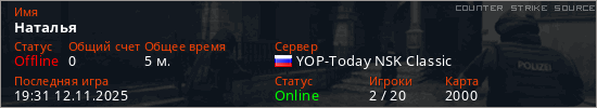 Играет на Counter Strike Source сервере. Страна: РоссияПервый раз замечен 19:07 12.11.2025