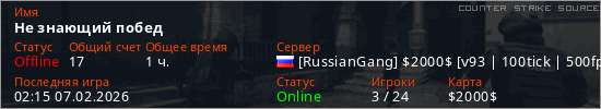 Играет на Counter Strike Source сервере. Страна: РоссияПервый раз замечен 18:28 05.02.2026