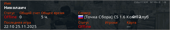 Играет на Counter Strike 1.6 сервере. Страна: РоссияПервый раз замечен 08:47 05.10.2025