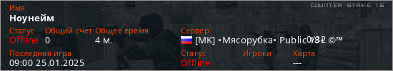 Играет на Counter Strike 1.6 сервере. Страна: РоссияПервый раз замечен 09:00 25.01.2025