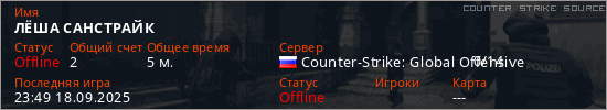 Играет на Counter Strike Source сервере. Страна: РоссияПервый раз замечен 23:31 18.09.2025