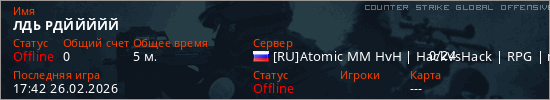 Играет на Counter Strike Global Offensive сервере. Страна: РоссияПервый раз замечен 17:39 26.02.2026