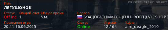 Играет на Counter Strike Source сервере. Страна: РоссияПервый раз замечен 20:33 16.06.2025