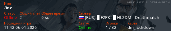 Играет на Half Life 2 DeathMatch сервере. Страна: РоссияПервый раз замечен 11:36 06.01.2026
