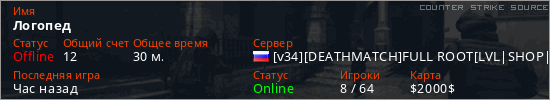 Играет на Counter Strike Source сервере. Страна: РоссияПервый раз замечен 08:20 14.01.2026