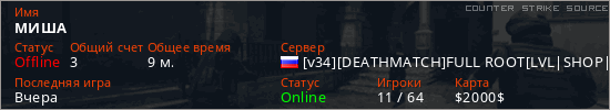 Играет на Counter Strike Source сервере. Страна: РоссияПервый раз замечен 11:18 27.03.2026