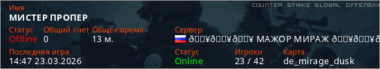 Играет на Counter Strike Global Offensive сервере. Страна: РоссияПервый раз замечен 18:40 19.05.2024