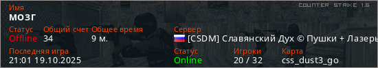 Играет на Counter Strike 1.6 сервере. Страна: РоссияПервый раз замечен 20:06 19.10.2025
