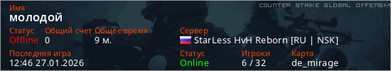 Играет на Counter Strike Global Offensive сервере. Страна: РоссияПервый раз замечен 23:27 19.01.2026