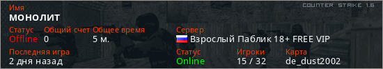 Играет на Counter Strike 1.6 сервере. Страна: РоссияПервый раз замечен 08:30 14.03.2026