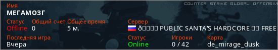 Играет на Counter Strike Global Offensive сервере. Страна: РоссияПервый раз замечен 01:09 02.01.2026