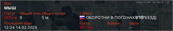 Играет на Counter Strike 1.6 сервере. Страна: РоссияПервый раз замечен 12:10 14.02.2026