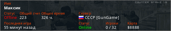 Играет на Counter Strike 1.6 сервере. Страна: РоссияПервый раз замечен 06:10 31.01.2026