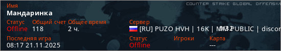 Играет на Counter Strike Global Offensive сервере. Страна: РоссияПервый раз замечен 10:00 21.05.2025