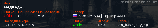 Играет на Counter Strike Source сервере. Страна: РоссияПервый раз замечен 12:07 09.10.2025