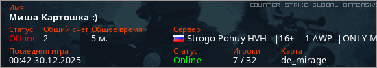 Играет на Counter Strike Global Offensive сервере. Страна: РоссияПервый раз замечен 00:29 30.12.2025