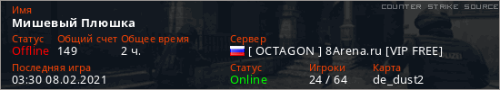Играет на Counter Strike Source сервере. Страна: РоссияПервый раз замечен 08:01 01.02.2021