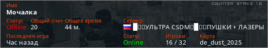 Играет на Counter Strike 1.6 сервере. Страна: РоссияПервый раз замечен 18:47 24.03.2026