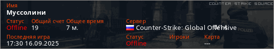 Играет на Counter Strike Source сервере. Страна: РоссияПервый раз замечен 17:00 16.09.2025