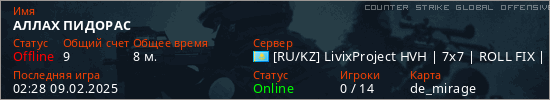 Играет на Counter Strike Global Offensive сервере. Страна: КазахстанПервый раз замечен 02:11 09.02.2025
