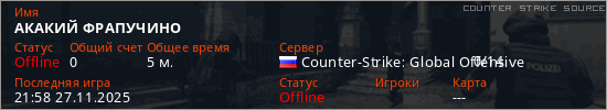 Играет на Counter Strike Source сервере. Страна: РоссияПервый раз замечен 21:56 27.11.2025