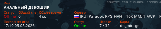Играет на Counter Strike Global Offensive сервере. Страна: РоссияПервый раз замечен 17:17 05.03.2026